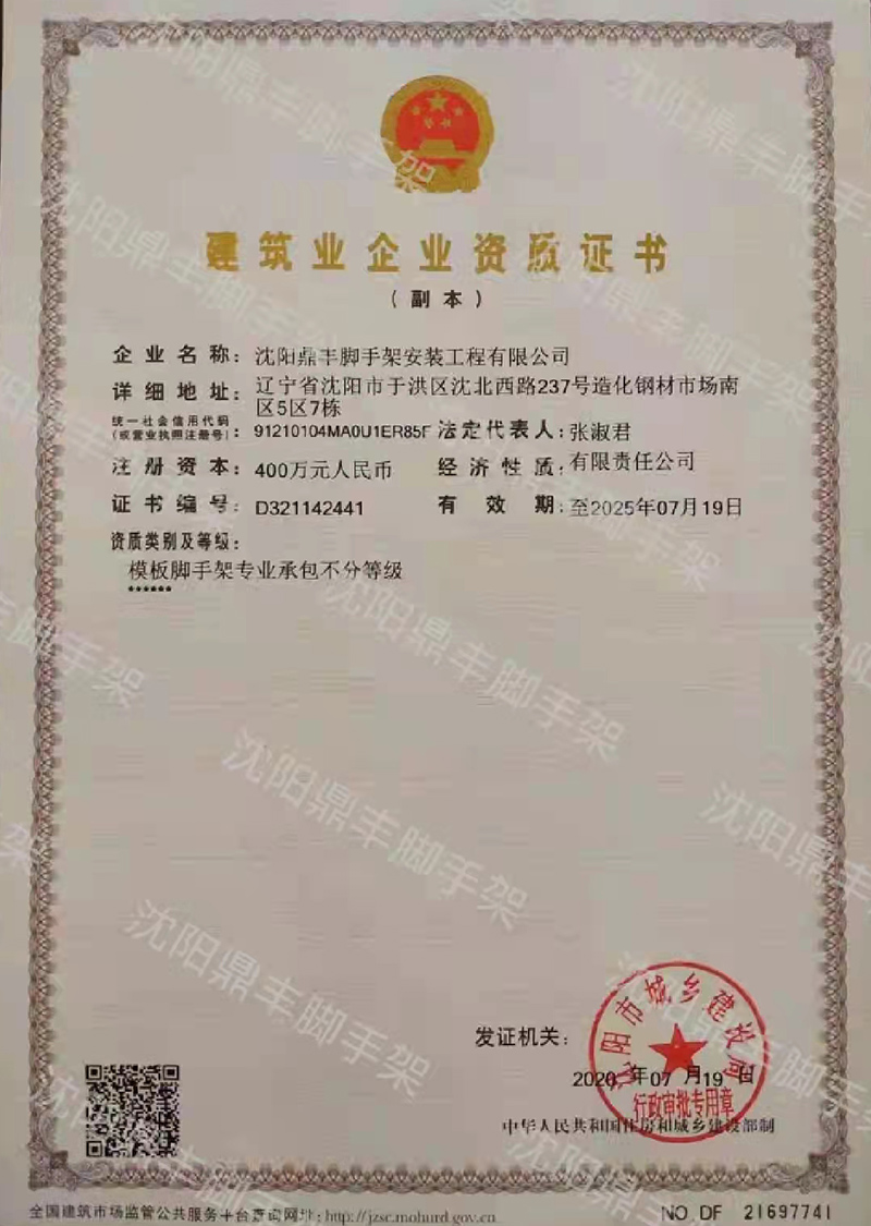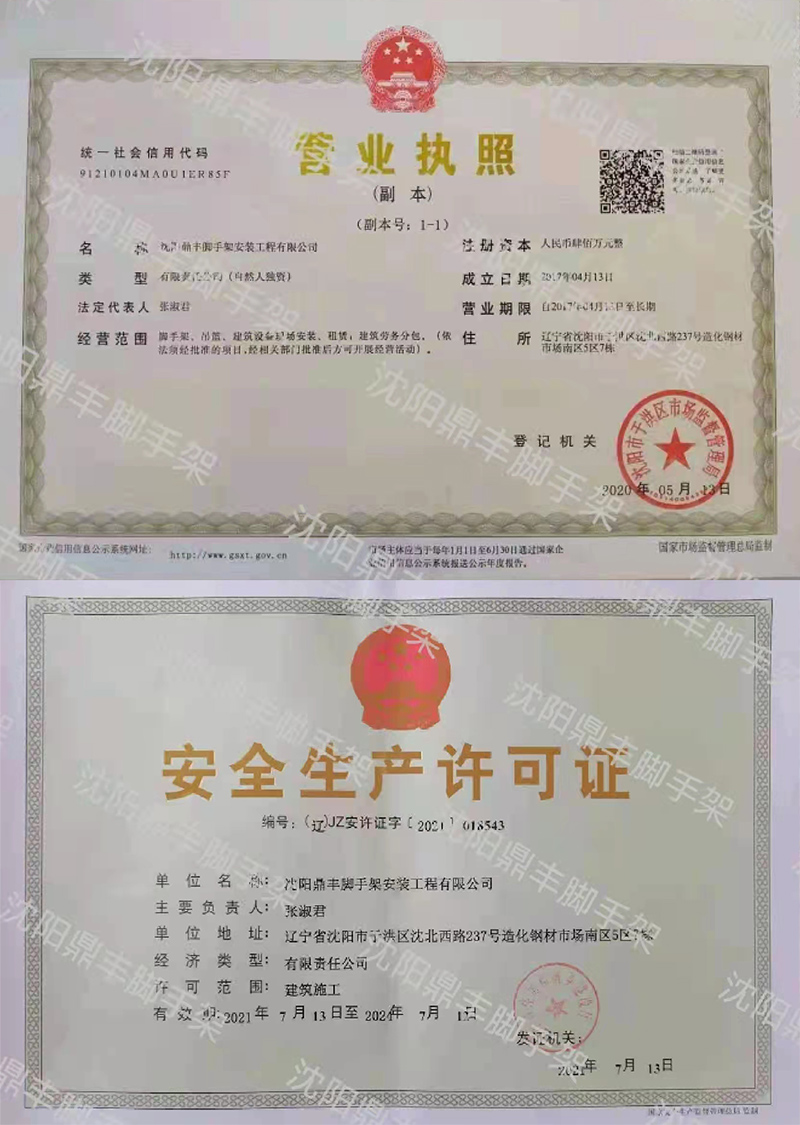 沈陽鼎豐腳手架安裝租賃公司主要租賃:鋼管、扣件、跳板(木、鐵)、U托、碗扣、移動腳手架、門式腳手架、盤式腳手架等服務(wù)項目;我公司現(xiàn)有有鋼管3000余噸,扣件100萬套,跳板5萬余塊,移動腳手架2萬余套,包括裝飾公司、幕墻公司、工程安裝公司、公共服務(wù) 單位和一些直接用戶。主要施工項目有:樓盤、酒店、賓館、寫字樓、體育館、歌劇院等各種商業(yè)公共設(shè)施的內(nèi)外腳手腳。